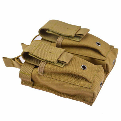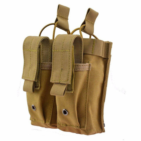 Two pistol mag pouches in the front, with adjustable hook and loop flap